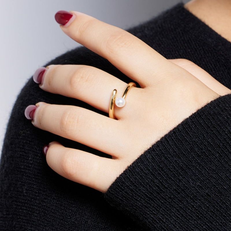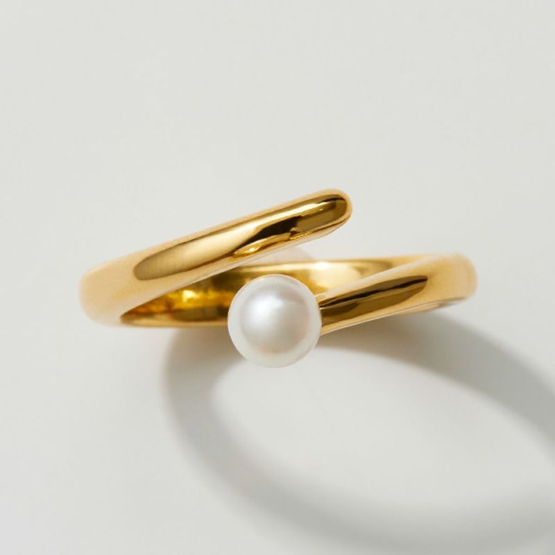 パールは大きすぎないサイズをチョイスし、他のリングとのレイヤードスタイルをお楽しみいただけるさりげないポイントに。
