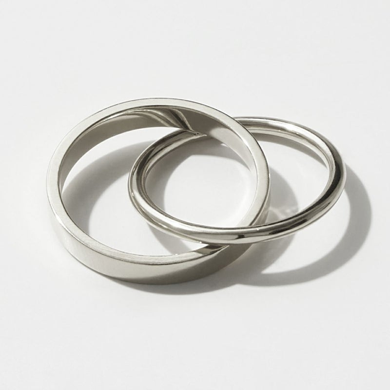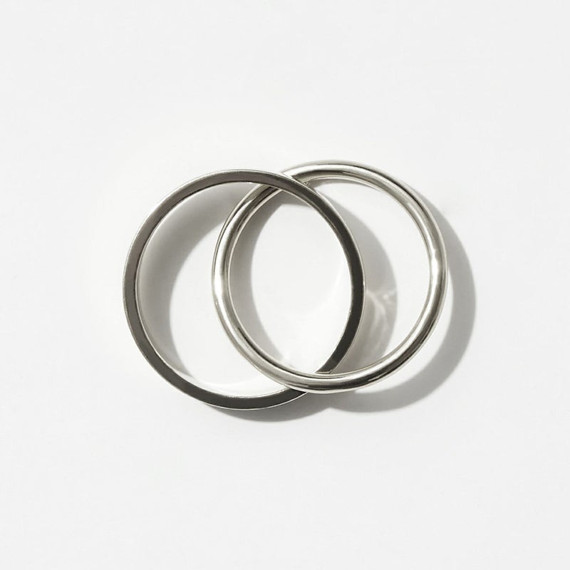 角ばったラインのリングと丸みのあるリングをクロスさせた2連リング。