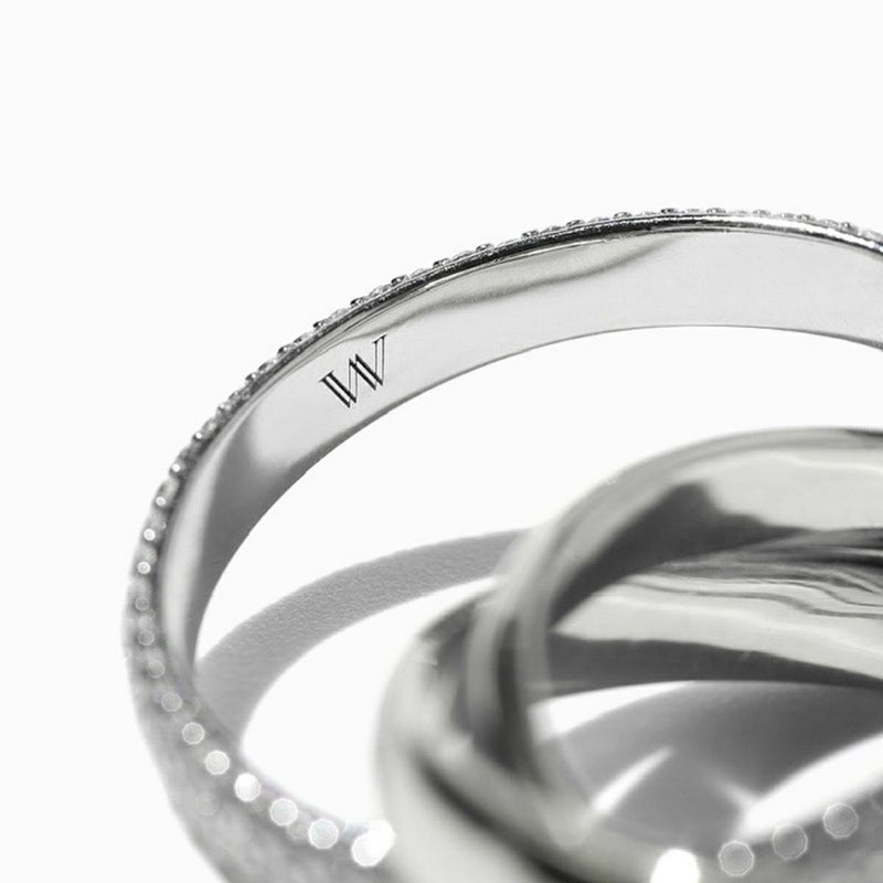 キラキラと輝くビジューが覗く、3つのリングを絡ませたリング。