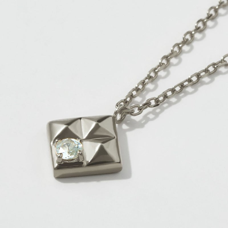 ダイヤモンド型のペンダントトップにスタッズ調の凹凸を施したミニマルながら、遊び心のあるデザイン。