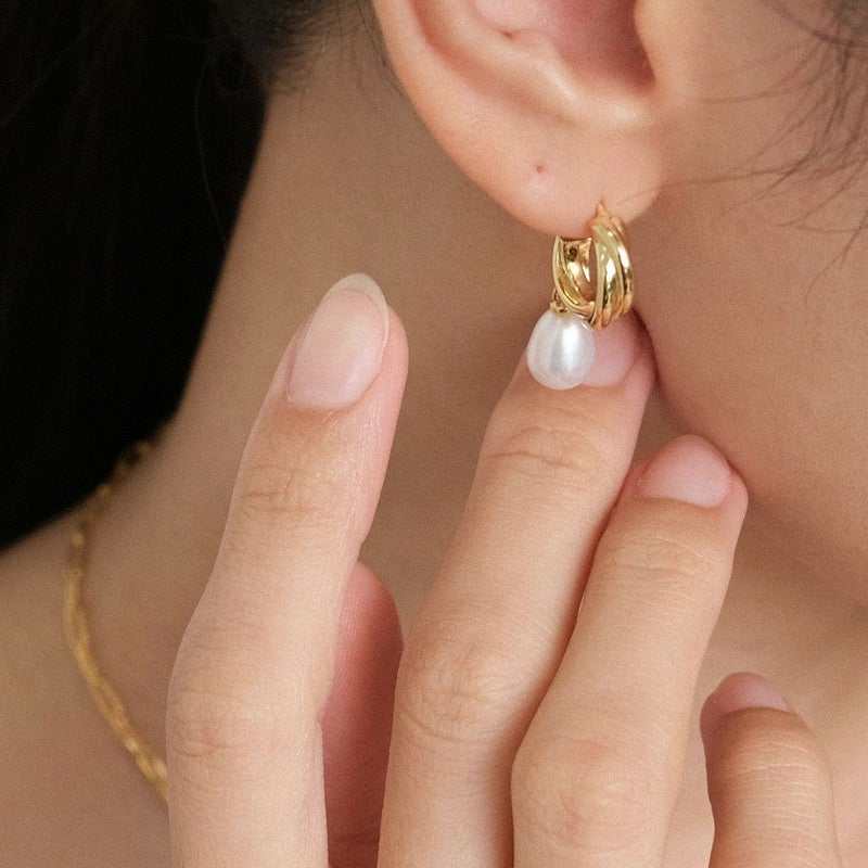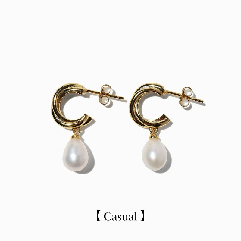 その下で揺れる淡水パールは縦長でほんのりしずく型にみえ、上品なイメージに。