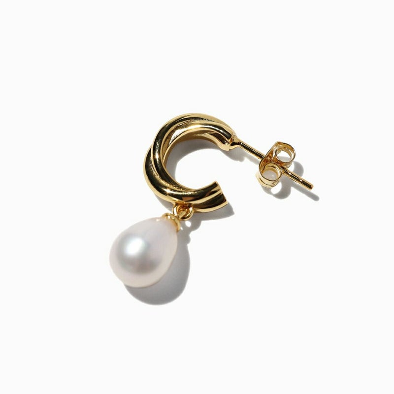 ツイストした個性あるフープと縦長のパールのバランス間が絶妙なピアス。