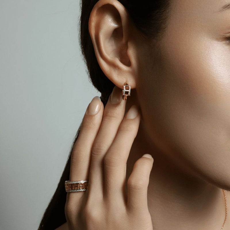ラグジュアリーなフォルムと立体的なフォルムのHモチーフのフープピアス。