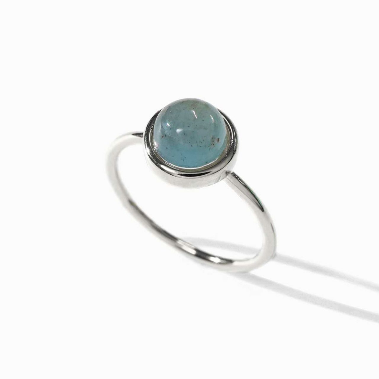 つるんとした質感と、ぷっくり丸みのあるボリューミーなアクアマリンがポイント。