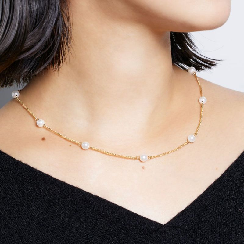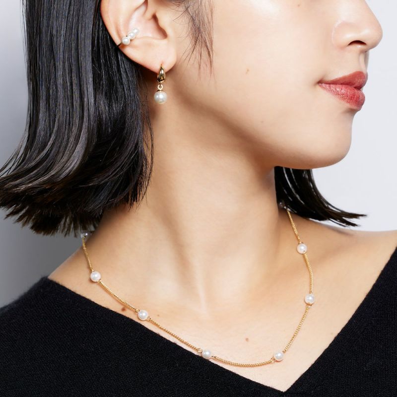 Station Pearl Necklace【Casual LINE】(Gold) 華奢なフォルムにパールをミックス。 フォルムを華奢にすることでセクシーさを際立たせ、まるで肌に溶け込むように輝くアクセサリー。 GENDERLESSに誰もがさりげなく楽しめるホリデーシーズンにぴったりのパールコレクション。 クールな印象の喜平チェーンにパールをステーション上にセッティングしたネックレス。 チェーンの輪っかの一つ(コマ)をひねって90度に押しつぶした面が同じ面で綺麗に並ぶ喜平チェーンを仕様することで重厚なイメージに。 細い喜平チェーンにすることでまるで肌に溶け込むように輝き、よりパールが際立つ様にと、こだわったネックレス。 チェーンの長さは3段階で調整が可能な仕様にしているので、お洋服や他のネックレスとの重ね着け、シーンに合わせてお楽しみいただけます。