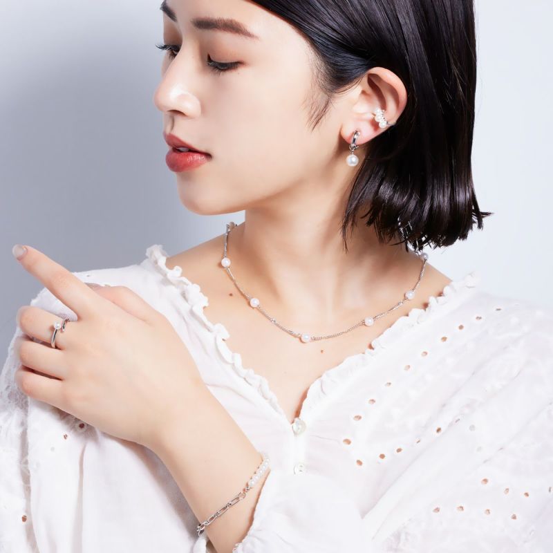 Station Pearl Necklace【Silver925 LINE】(Silver) 送料無料 吉野北人着用アイテム。 華奢なフォルムにパールをミックス。 フォルムを華奢にすることでセクシーさを際立たせ、まるで肌に溶け込むように輝くアクセサリー。 GENDERLESSに誰もがさりげなく楽しめるホリデーシーズンにぴったりのパールコレクション。 クールな印象の喜平チェーンにパールをステーション上にセッティングしたネックレス。 チェーンの輪っかの一つ(コマ)をひねって90度に押しつぶした面が同じ面で綺麗に並ぶ喜平チェーンを仕様することで重厚なイメージに。 細い喜平チェーンにすることでまるで肌に溶け込むように輝き、よりパールが際立つ様にと、こだわったネックレス。 チェーンの長さは3段階で調整が可能な仕様にしているので、お洋服や他のネックレスとの重ね着け、シーンに合わせてお楽しみいただけます。