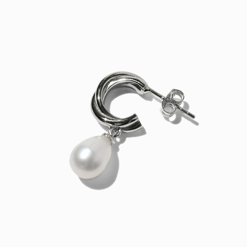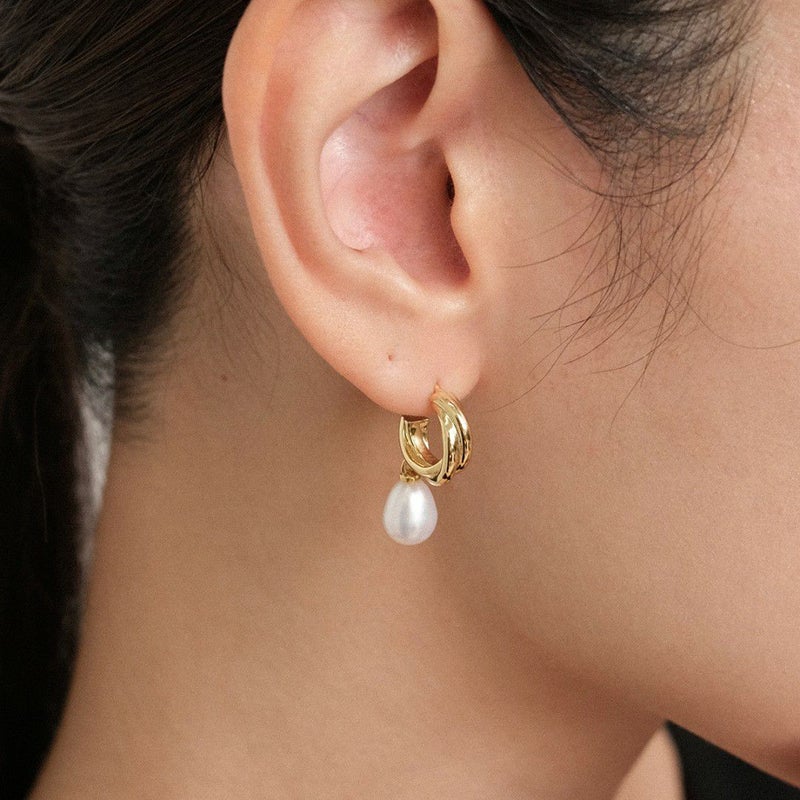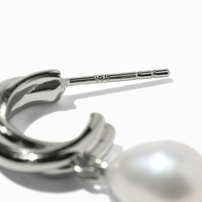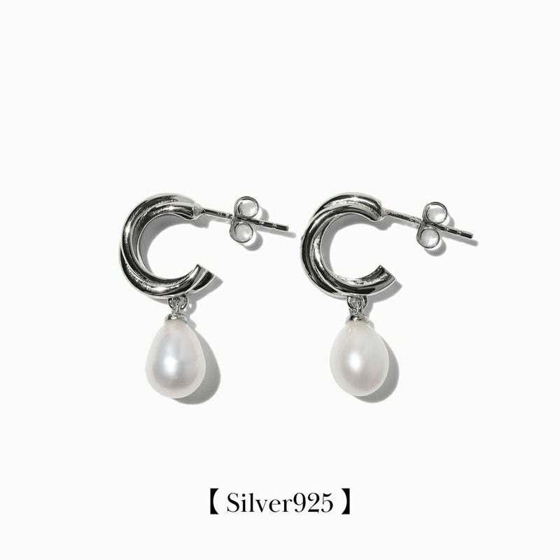 ツイストした個性あるフープと縦長のパールのバランス間が絶妙なピアス。