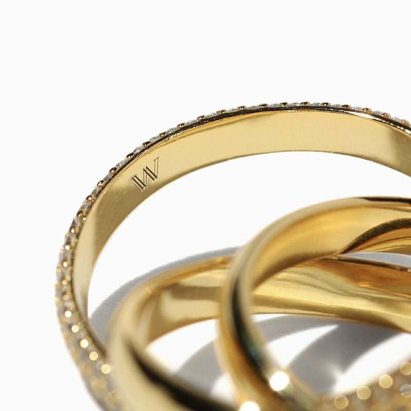 キラキラと輝くビジューが覗く、3つのリングを絡ませたリング。